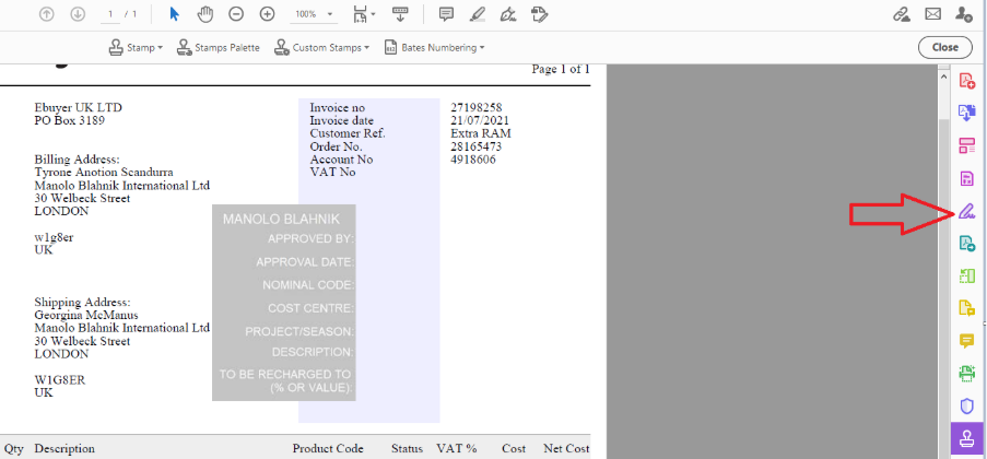 Step 9 – The stamp options are now seated above the invoice in the middle of the screen. Select “Stamp”, then “Accounts Stamps” and lastly select the “Approval Stamp”. It will appear and you can decide where to place it. Please find a blank space to place it as it will cover anything behind it.