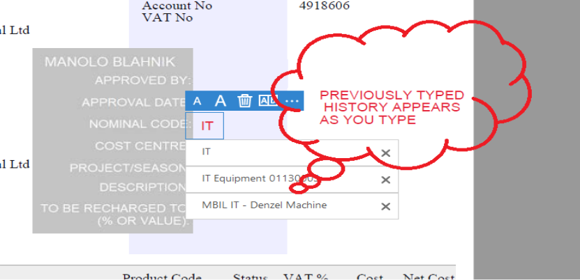 Step 12 – Adobe remembers what you have typed previously. But when filling in your detail for the first time, you need to type the full codes and descriptions. That means you only ever have to type the code description and code in once, after which you only have to remember the type of expense. Start typing the description and it will appear in your history. Just select it and then it will populate with the correct code.