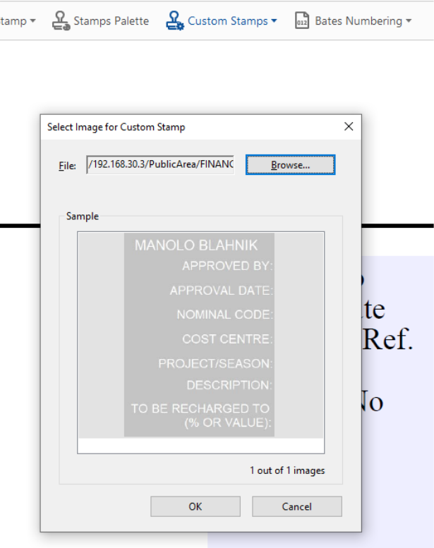 Step 5 – Then, select “Browse” and navigate to your “My Documents” on your laptop and select the file that you have downloaded on the step 1. If you have Adobe Acrobat Reader you must use the file “Stamp.pdf” now if you have Adobe Acrobat Pro DC you can use either “Approval Stamp Template.jpg” or “Stamp.pdf”. Select OK at the bottom.