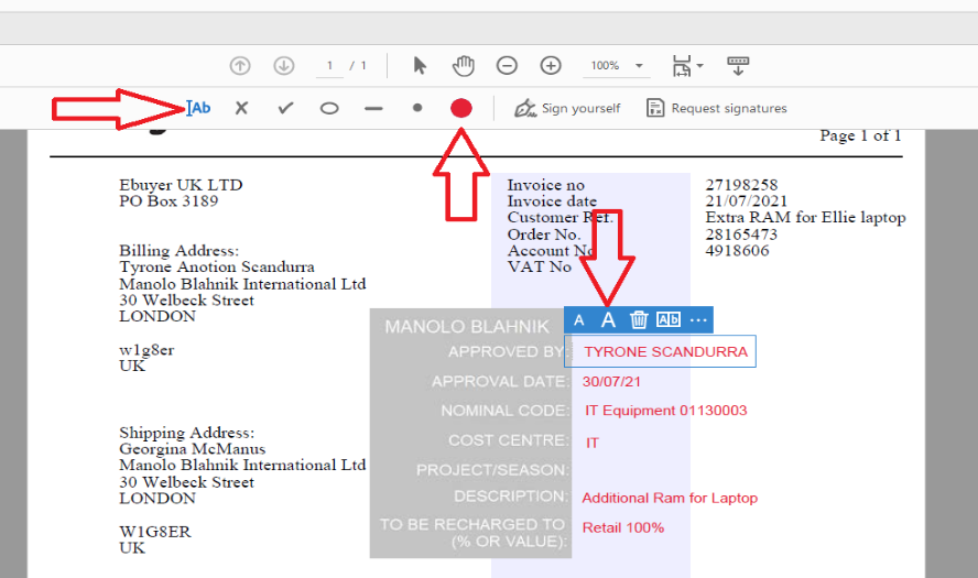 Step 11 – The fill and sign option open at the top of the screen in the centre. First, select the {AB sign, then select the font colour red and lastly select the line you would like to fill in. (if the font is too large or too small use the A A option that appears above the text you are typing).
